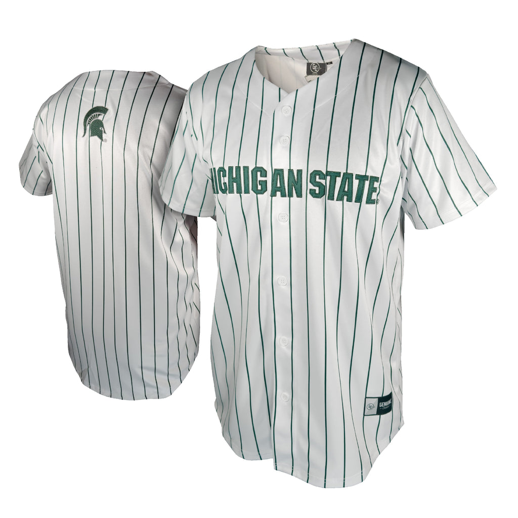 Show your Spartan pride on game day with this Michigan State Spartans Pinstripe Baseball Jersey. Featuring classic green vertical pinstripes on a clean white base, this jersey brings a timeless, on-field look to your fan gear collection.
