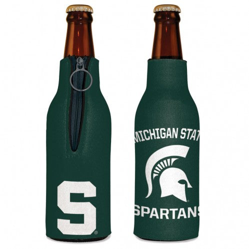 Everyone deserves hugs, even your bottles. Get this zipper pull cooler to keep your drink cold and your hands dry. Perfect for game day tailgates. This cooler has a two sided design: One side of the cooler features the Spartan "S". The other side reads "Michigan State Spartans" over the Spartan helmet.