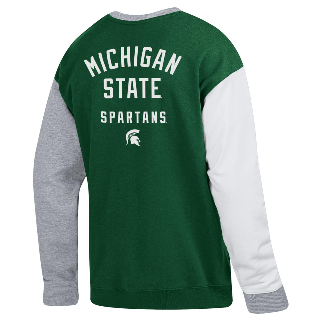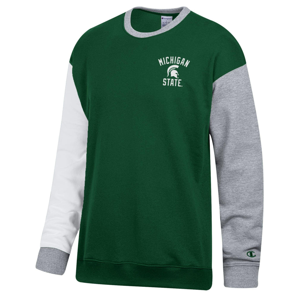 Celebrate your Spartan pride in style with this officially licensed Michigan State University crewneck sweatshirt by Champion. Designed with a bold and modern colorblock aesthetic, this sweatshirt features a rich green body complemented by gray sleeves and white lower sleeve panels. The ribbed gray cuffs and collar add a classic touch while ensuring a comfortable fit.