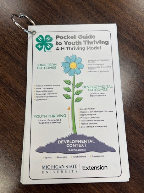 4-H Youth Development programs help youth Thrive! The 4-H Thriving Model helps us understand how a youth’s level of engagement in 4-H can predictably influence their overall development. The 4-H Thriving Model takes place through local, statewide, and national 4-H experiences youth are engaging in with 4-H volunteers like yourself. Being happy or appearing to have everything they need to succeed does not mean a youth is thriving. As a volunteer, you play a key role in this process! By building positive relationships, creating opportunities for growth, and asking thoughtful questions you can be part of helping youth thrive through the 4-H program.