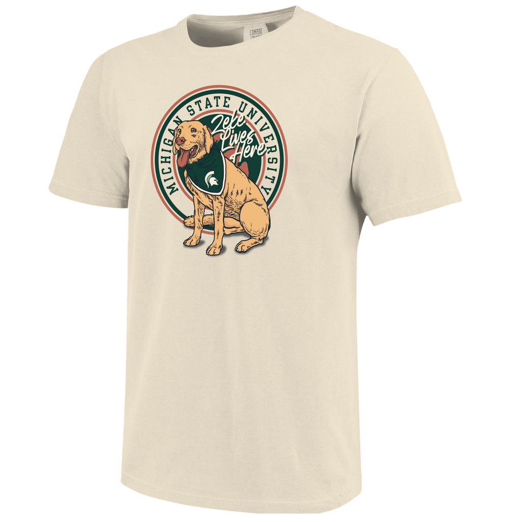 This standout Michigan State University tee features a bold, full-color illustration of Zeke front and center, framed by an eye-catching circular MSU emblem and the spirited message “Zeke Lives Here.” It’s the perfect blend of school tradition, loyal fandom, and pure canine charm.
